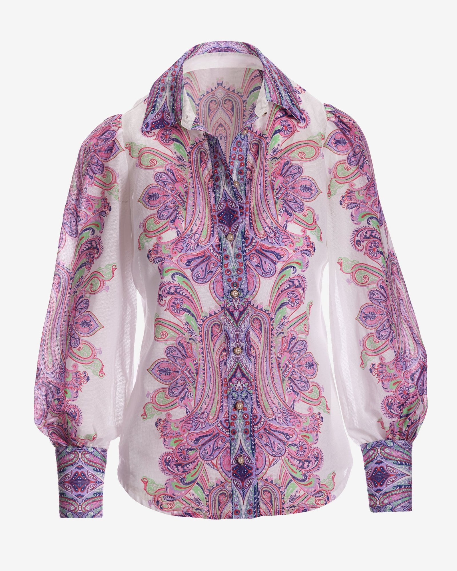 Our Boca Raton Paisley Print Victoria Shirt lends a sophisticated and vibrant touch to your wardrobe. It features a lightweight organza fabric. chic drama sleeves. and pearl buttons. Wear it tucked or untucked with trousers or suiting for polished looks with flair.